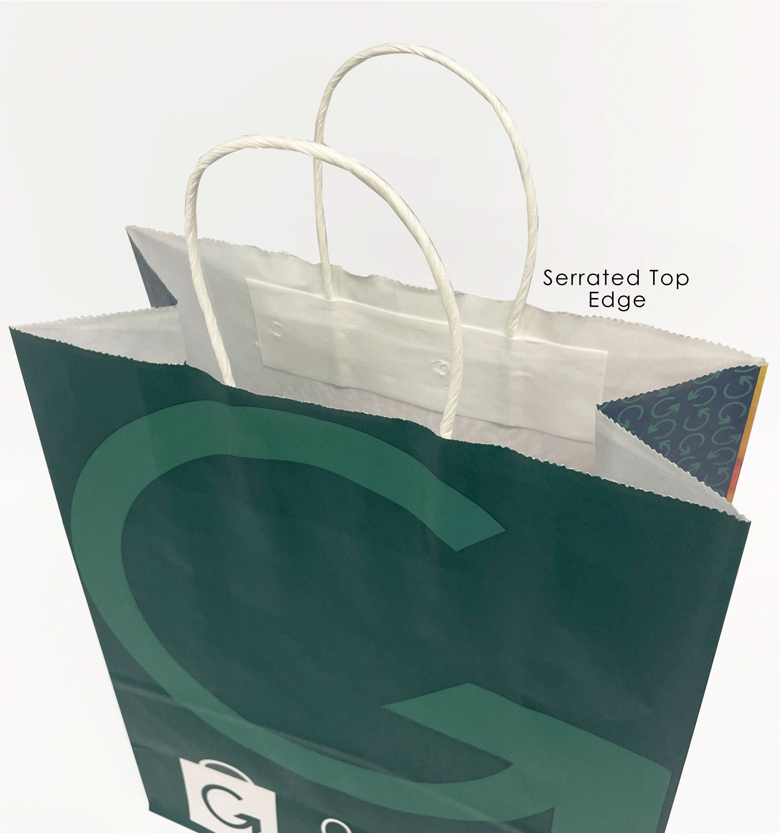 We offer serrated top and J-cut (turn top) paper shopping bags, including custom printed options, available in brown kraft, white kraft and versa kraft paper.