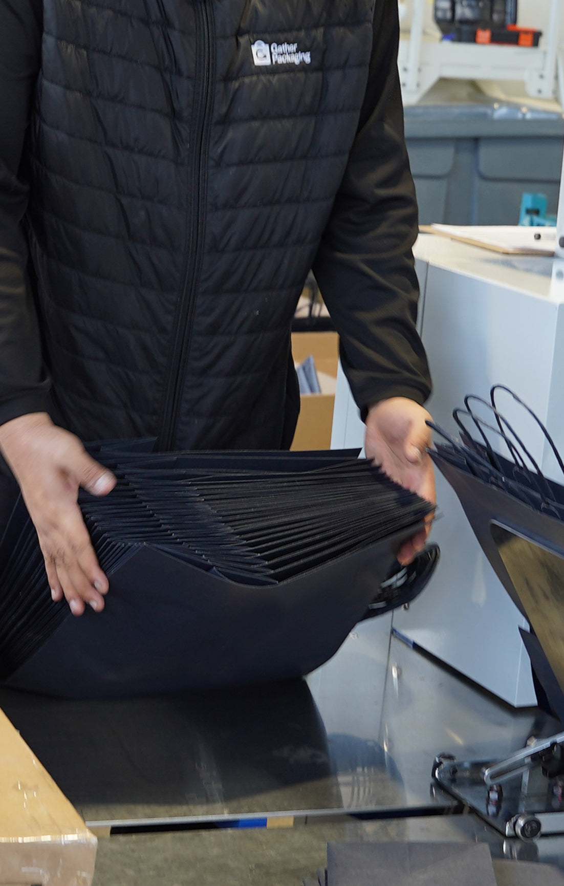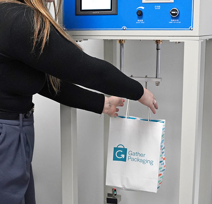 At Gather Packaging, we prioritize material quality from the very beginning. Upon receiving raw materials, they are carefully inspected to evaluate tensile strength, verify grams per square meter (GSM) and paper weight, confirm recycled content, and assess surface printability. We ensure all paper that goes into paper bag production is lab tested and undergoes strict quality control to ensure all materials meet approval standards before mass production. This proactive approach prevents potential defects and reinforces our commitment to quality assurance at every stage.